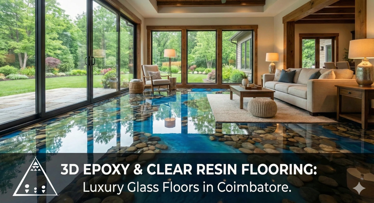 Most people hear 3D Epoxy Flooring and think of sticker prints. That is not what we do. For a luxury farmhouse, “3D” means Real Depth. We use high-grade Clear Casting Resin to encapsulate real elements like stones or leaves inside the floor.