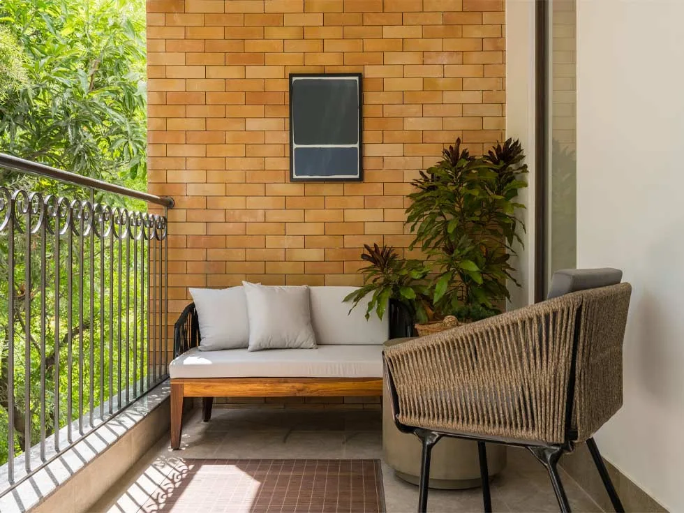 This farmhouse balcony style integrates the famous Kerala wooden bench (Charupady) directly into the balcony railing. It allows for comfortable, built-in seating where you can lean back and enjoy the breeze. It is a timeless Coimbatore home construction choice, often featuring terracotta roof tiles overhead to provide deep shade—perfect for the NRI luxury deck owner who appreciates heritage and natural cooling.